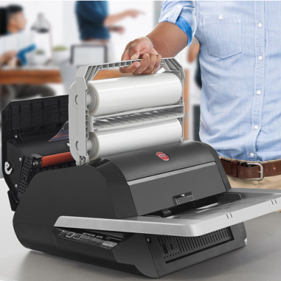 Plastifieuse GBC Foton 30. La première plastifieuse de bureau TOTALEMENT automatique au monde. Pour des documents parfaitement plastifiés en un rien de temps. C’est comme s’il y avait deux mains supplémentaires au bureau. Économisez 98% de votre temps. Chargez, Appuyez sur Start et Le tour est joué. Elle plastifie et vous pouvez faire autre chose.
